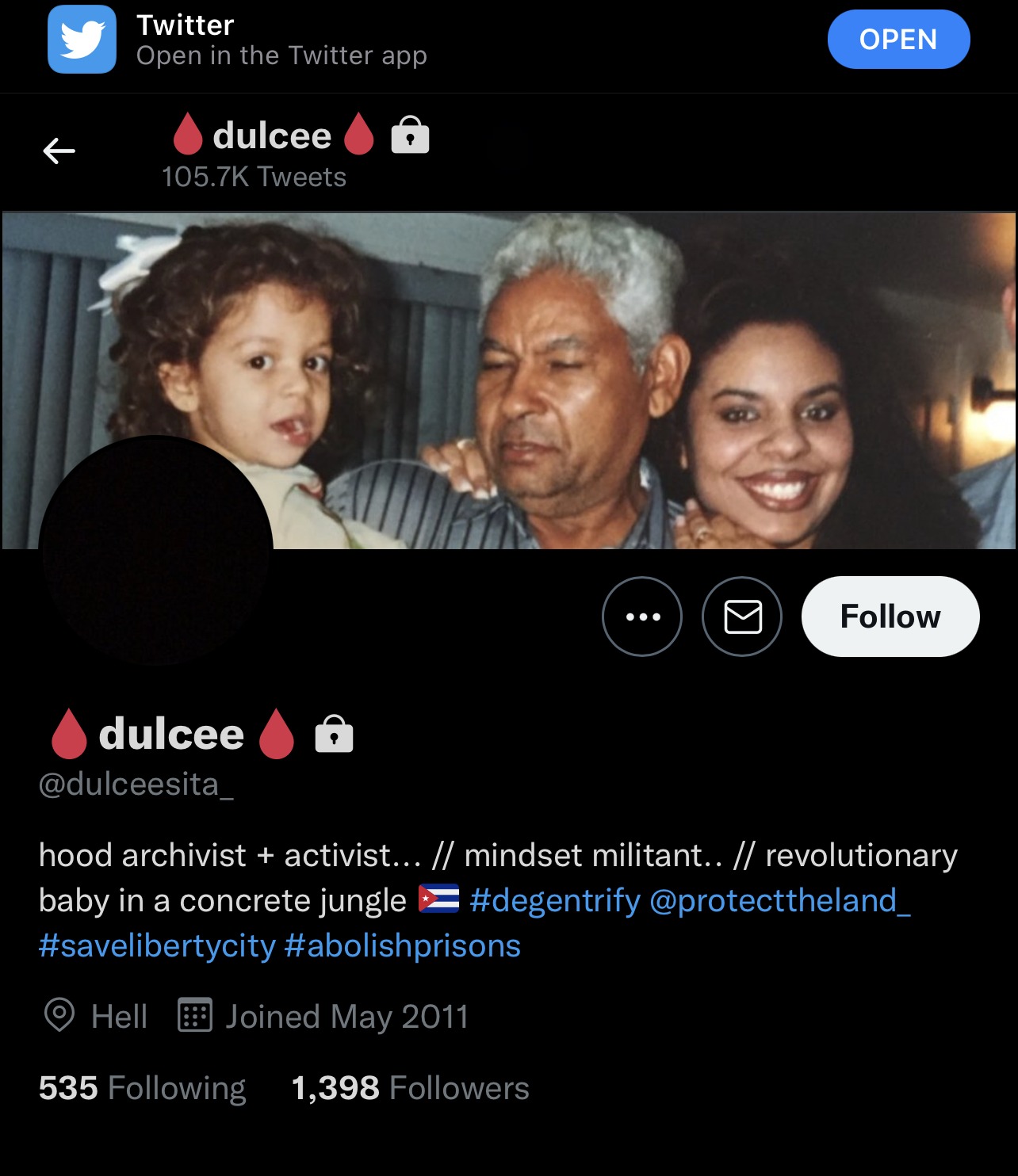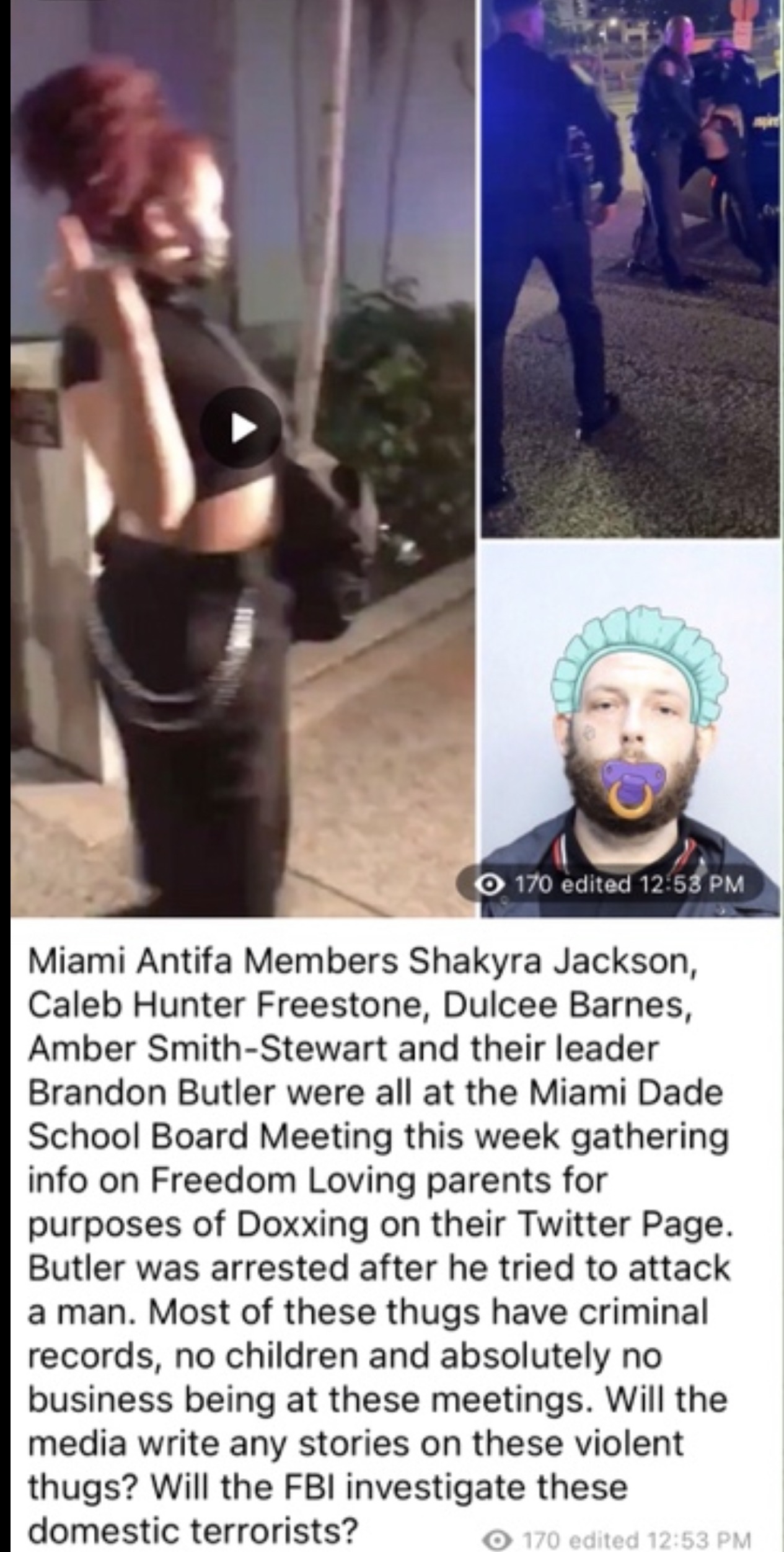 https://twitter.com/CFDoxxer/status/1463563223077109765 https://www.miaminewtimes.com/news/video-shows-miami-police-grab-breast-of-protester-11661608 Active with antifa groups and networks raising money and in actions. Reportedly runs an onlyfans too Dulcee barnes doxxes parents and citizens online through Twitter accounts, terrorizes and harasses parents and businesses