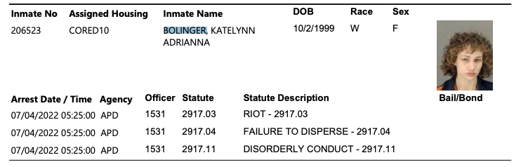 Arrested during Akron BLM riots. Arrest Date / Time Agency Officer Statute Statute Description Bail/Bond 07/04/2022 05:25:00 APD 1531 2917.03 RIOT - 2917.03 07/04/2022 05:25:00 APD 1531 2917.04 FAILURE TO DISPERSE - 2917.04 07/04/2022 05:25:00 APD 1531 2917.11 DISORDERLY CONDUCT - 2917.11