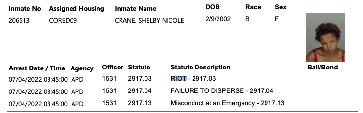 Arrested during Akron BLM riots. Arrest Date / Time Agency Officer Statute Statute Description Bail/Bond 07/04/2022 03:45:00 APD 1531 2917.03 RIOT - 2917.03 07/04/2022 03:45:00 APD 1531 2917.04 FAILURE TO DISPERSE - 2917.04 07/04/2022 03:45:00 APD 1531 2917.13 Misconduct at an Emergency - 2917.13