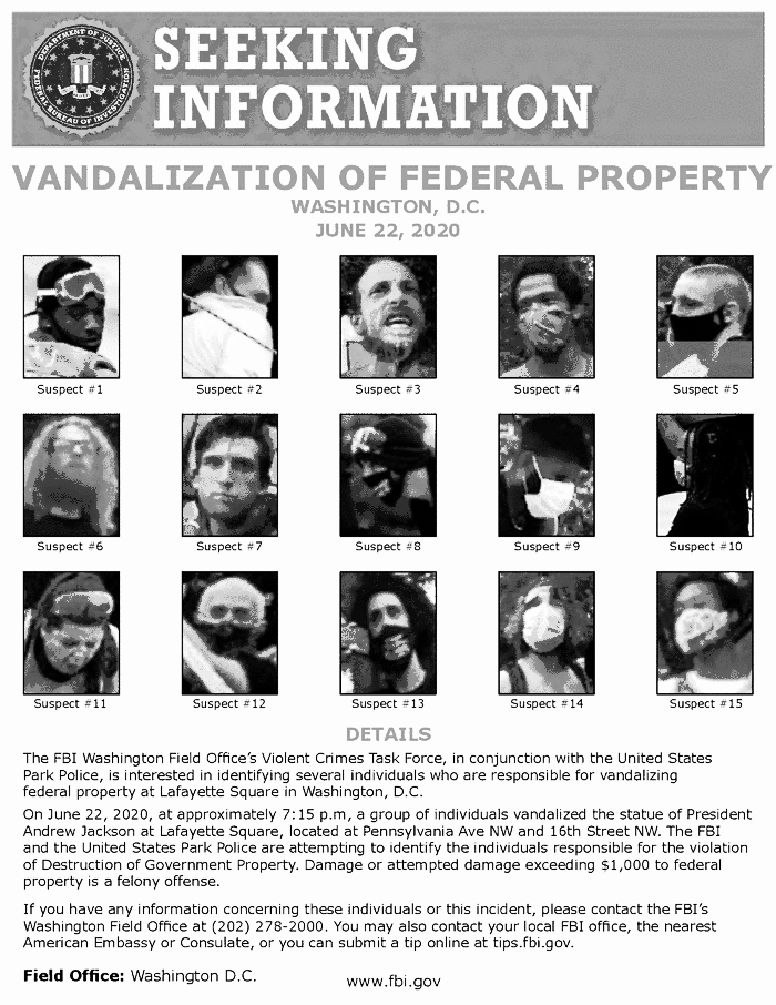 https://www.justice.gov/usao-dc/pr/four-men-charged-federal-court-attempting-tear-down-statue-andrew-jackson-lafayette https://mobile.twitter.com/realDonaldTrump/status/1276999172915376128 https://www.courtlistener.com/docket/17316170/united-states-v-lloyd/