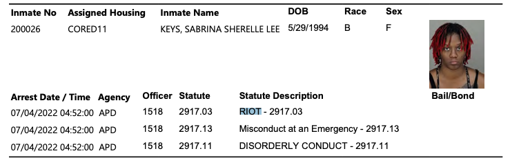 Arrested during Akron BLM riots. Arrest Date / Time Agency Officer Statute Statute Description Bail/Bond 07/04/2022 04:52:00 APD 1518 2917.03 RIOT - 2917.03 07/04/2022 04:52:00 APD 1518 2917.13 Misconduct at an Emergency - 2917.13 07/04/2022 04:52:00 APD 1518 2917.11 DISORDERLY CONDUCT - 2917.11