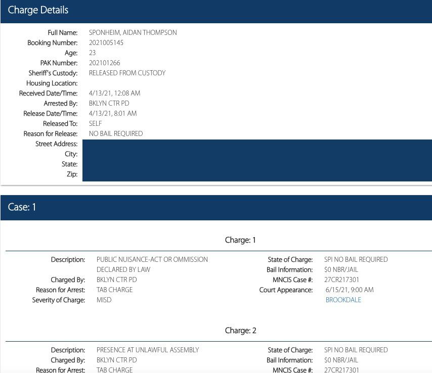 Brooklyn Center 4/12 riot Aiden Sponheim (23) arrested and released bail free. Member of a number of left wing groups and a fan of Ilhan Omar https://www.linkedin.com/in/aidansponheim/ Enrolled at UoM according to social media.
