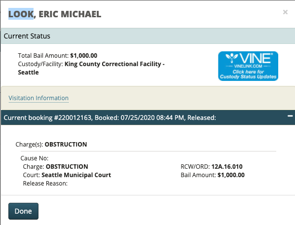Seattle July 25th riots. He lost part of his front two teeth when he was arrested and later sued the city. His last known address was in Bellevue https://web.archive.org/web/20231213144131/https://southseattleemerald.com/wp-content/uploads/2021/08/Third-Amended-Complaint-Draft-030221-Clean.pdf (pp. 149-152)