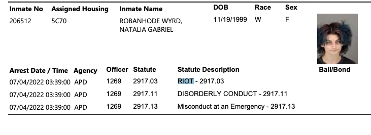 Arrested during Akron BLM riots. Arrest Date / Time Agency Officer Statute Statute Description Bail/Bond 07/04/2022 03:39:00 APD 1269 2917.03 RIOT - 2917.03 07/04/2022 03:39:00 APD 1269 2917.11 DISORDERLY CONDUCT - 2917.11 07/04/2022 03:39:00 APD 1269 2917.13 Misconduct at an Emergency - 2917.13