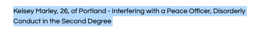 https://www.portlandoregon.gov/police/news/read.cfm?id=271268 https://archive.vn/Mhor0 Kelsey Marley, 26, of Portland - Interfering with a Peace Officer, Disorderly Conduct in the Second Degree