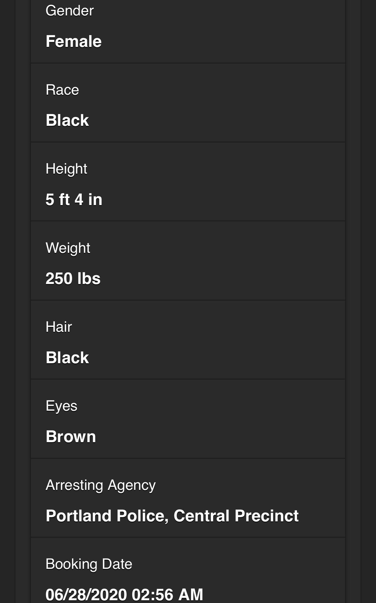 * Tarina Bryan, 27 years-old, Resisting Arrest, Interfering With a Police Officer, Disorderly Conduct II https://www.portlandoregon.gov/police/news/read.cfm?id=250932 https://www.mcso.us/PAID/Home/Booking/1505388