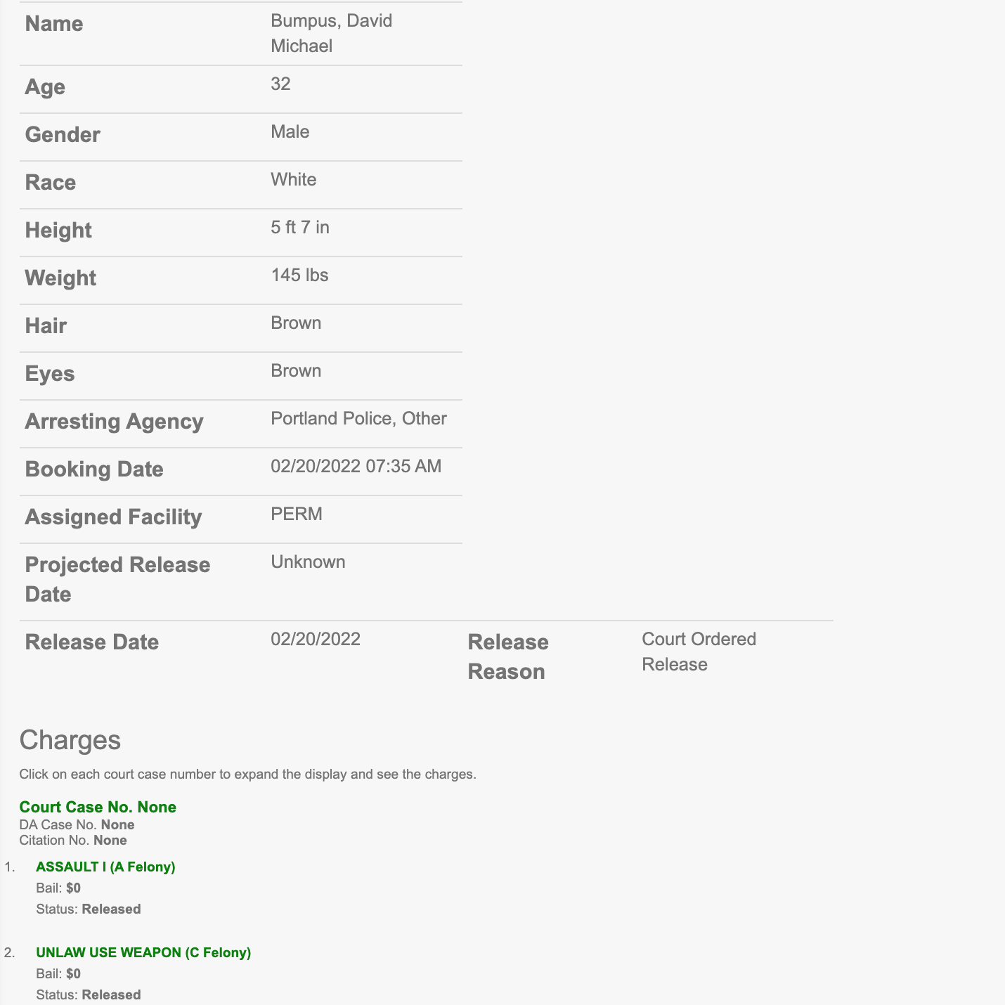 Portland Antifa member who with a mob of other violent antifa -- Dajah Beck ( https://antifawatch.net/ViewReport/1c233b4c ) and Isabel Araujo (https://antifawatch.net/ViewReport/3a0c6862) was running security at a JFPK march. JFPK is known for being a violent event with others attacked and guns pointed at them previously. Arrested for shooting a resident after an altercation of some kind. Charged with Assault I and unlawful use of a weapon. Charges dropped by leftist DA despite "key evidence" having been taken from the crime scene by Antifa. https://www.oregonlive.com/crime/2022/02/portland-police-confirm-identity-of-alleged-gunman-in-normandale-park-shooting.html https://www.linkedin.com/in/davidbumpusmfa (deleted) https://www.facebook.com/dbumpus1 (deleted) https://oem.adpearance.com/about/us - employed here.
