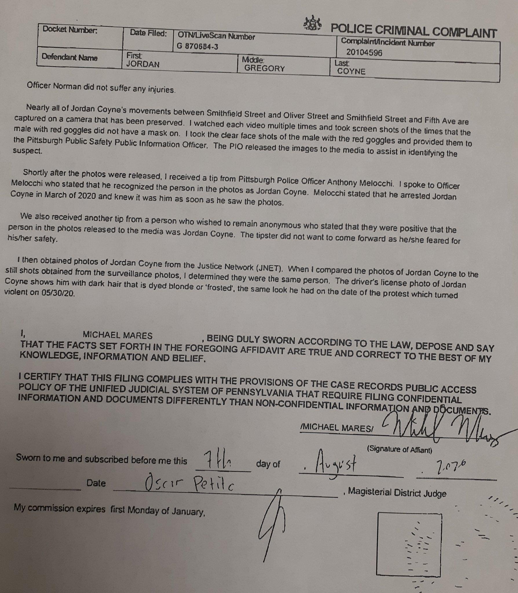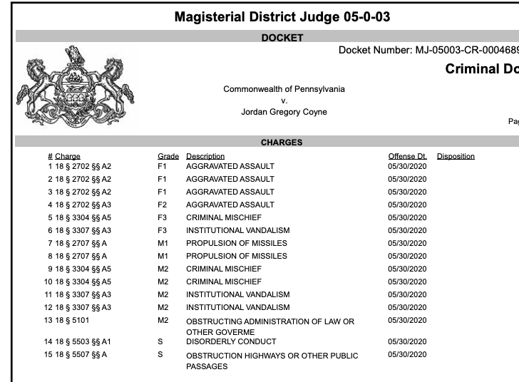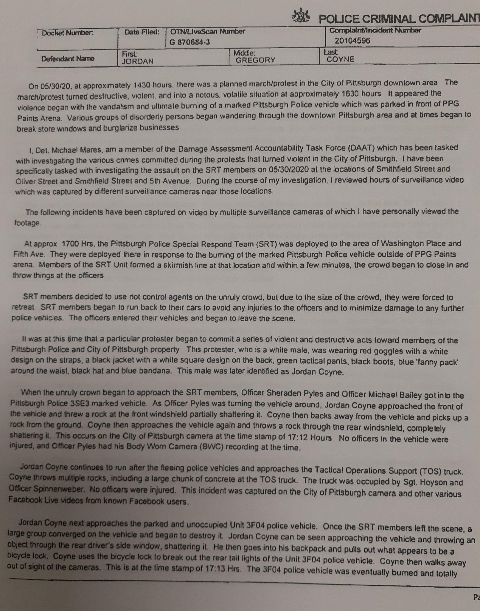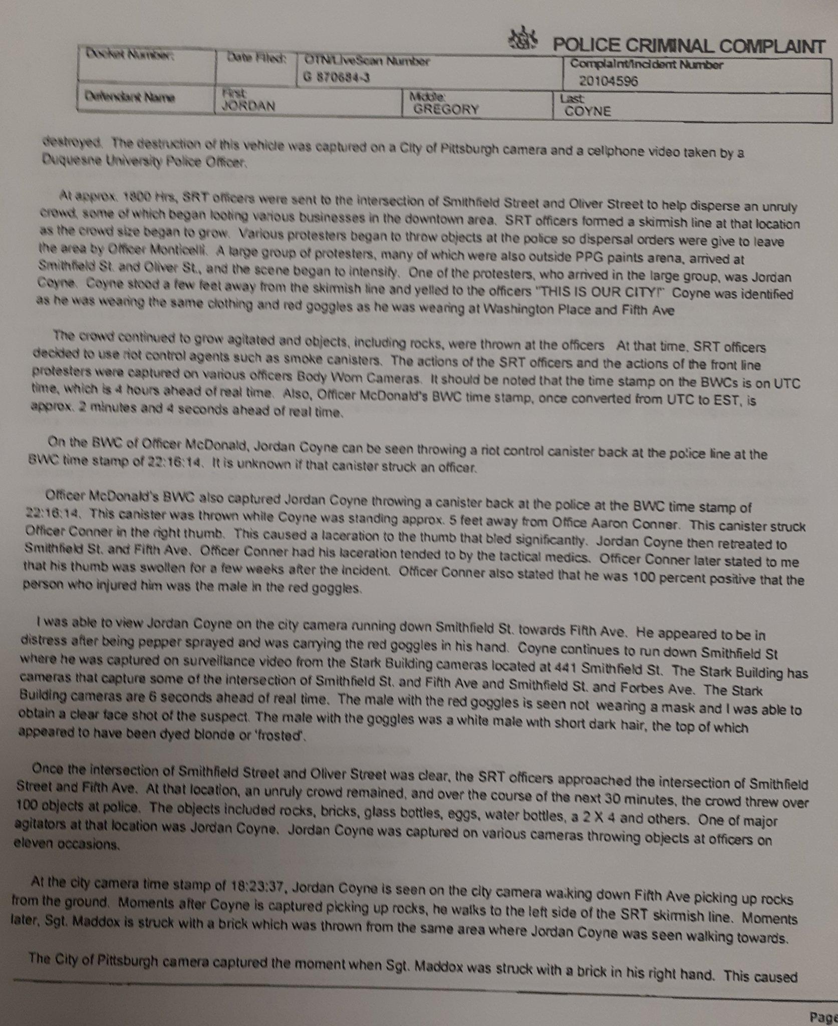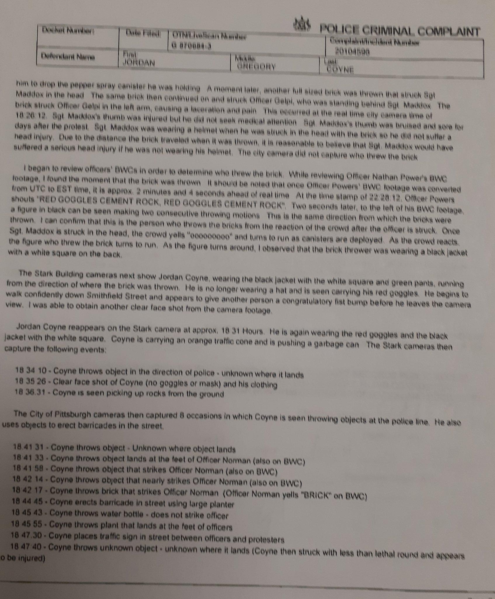 Read the criminal complaints His Fundraise - ToS #12 violation ( raising money for legal defense of violent acts) https://fundrazr.com/support-jordan First Story - https://www.msn.com/en-us/news/crime/city-police-seek-alleged-rioter-for-assaulting-officers/ar-BB17Iawn Charged with 1 18 § 2702 §§ A2 F1 AGGRAVATED ASSAULT 05/30/2020 2 18 § 2702 §§ A2 F1 AGGRAVATED ASSAULT 05/30/2020 3 18 § 2702 §§ A2 F1 AGGRAVATED ASSAULT 05/30/2020 4 18 § 2702 §§ A3 F2 AGGRAVATED ASSAULT 05/30/2020 5 18 § 3304 §§ A5 F3 CRIMINAL MISCHIEF 05/30/2020 6 18 § 3307 §§ A3 F3 INSTITUTIONAL VANDALISM 05/30/2020 7 18 § 2707 §§ A M1 PROPULSION OF MISSILES 05/30/2020 8 18 § 2707 §§ A M1 PROPULSION OF MISSILES 05/30/2020 9 18 § 3304 §§ A5 M2 CRIMINAL MISCHIEF 05/30/2020 10 18 § 3304 §§ A5 M2 CRIMINAL MISCHIEF 05/30/2020 11 18 § 3307 §§ A3 M2 INSTITUTIONAL VANDALISM 05/30/2020 12 18 § 3307 §§ A3 M2 INSTITUTIONAL VANDALISM 05/30/2020 13 18 § 5101 M2 OBSTRUCTING ADMINISTRATION OF LAW OR OTHER GOVERME05/30/2020 14 18 § 5503 §§ A1 S DISORDERLY CONDUCT 05/30/2020 15 18 § 5507 §§ A S OBSTRUCTION HIGHWAYS OR OTHER PUBLIC PASSAGES https://www.justice.gov/usao-wdpa/pr/pittsburgh-man-indicted-throwing-projectiles-police-officers-and-damaging-police Indicted Federally. https://www.courtlistener.com/docket/18428335/united-states-v-coyne/