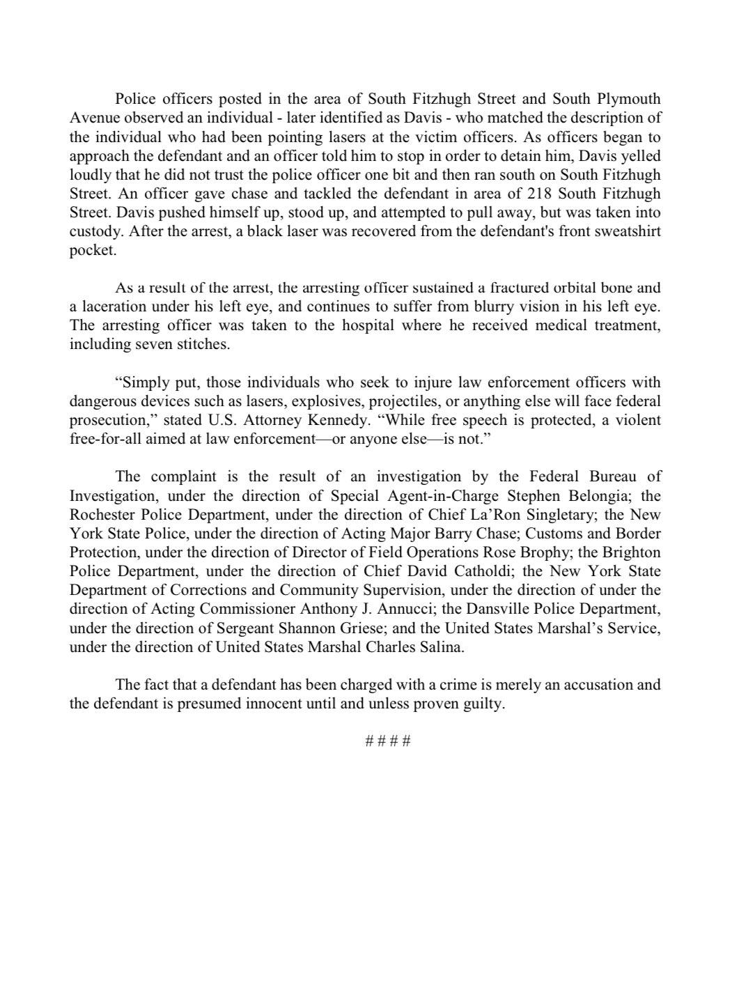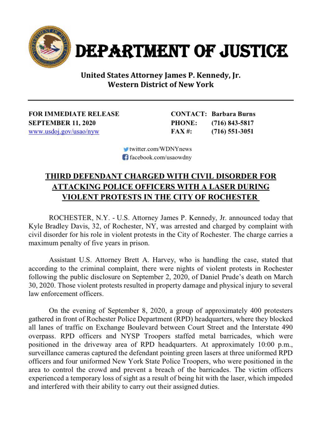 https://twitter.com/RPD_PSI/status/1304508689445982210 Today, the U.S. Attorney’s Office charged Kyle Davis, 32, a city resident, with Civil Disorder under 18 U.S.C. 231(a)(3). He was arraigned in Federal Court. Davis is alleged to have pointed a green laser in the eyes of 7 officers.