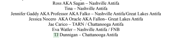 https://drive.google.com/file/d/1r7MEVzNHKh8FQ-wGTmiCbPhQAvp9RHpV/view TJ Dunnigan – Chattanooga Antifa see pdf