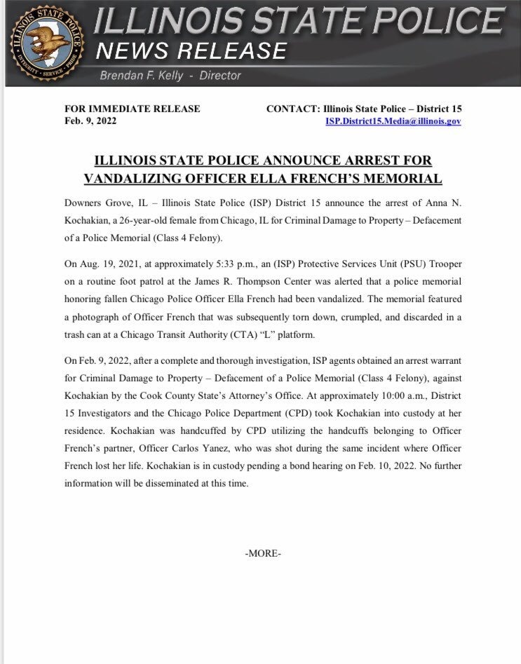 https://twitter.com/MrAndyNgo/status/1491774569442590721 The Illinois State Police have arrested Anna N. Kochakian, 26, of Chicago, for criminal damage to property. The extremist anarchist-communist proudly filmed herself defacing a memorial last year to murdered @Chicago_Police officer, Ella French. She's a gender studies major at DePaul University.