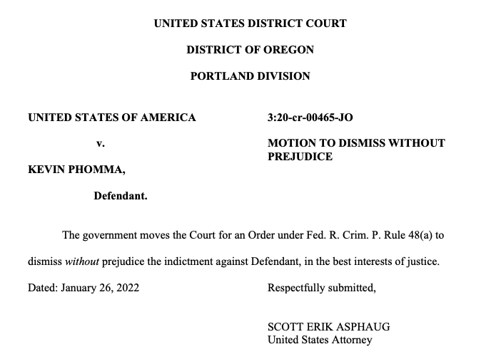 Phomma then pled to state charges in Janauary 2022, with a sentencing date set for an entire year in the future. He pled to only 3 of the felonies, assault and two charges of use of mace. Despite the local DA Mike Schmidt's reputation for enabling violent left wing criminality, the Oregon US Attorney's Office under Scott Asphaug dismissed the federal case.