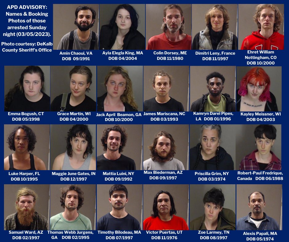 All 23 arrestees were booked into Dekalb County Jail for domestic terrorism. Of the 23 arrests, only 2 of the 23 were listed as from Georgia. Others came from NYC, Boston, Worcester, Baton Rouge, Colorado, Quebec Canada, France, Arizona, Florida, Connecticut, Wisconsin, North Carolina, Virginia, Utah, and Indiana. This has been a repeated pattern for Stop Cop City, with out of state persons making up the majority of the arrests.