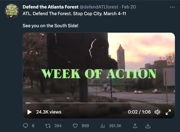 Following the shootout death of Manuel 'Tortuguita' Teran on January 18th 2023 and subsequent black bloc riot on the 21st members of the Antifa connected Stop Cop City began making calls for a week of action. The week of action has been a repeated tactic over the course of the past year to rally supporters from across the country to make their way to Atlanta and engage in a direct action against the Cop City location as well as tangentially related organizations. This was the 5th Stop Cop City week of action, the planned date was agreed on for March the 4th to the 11th.